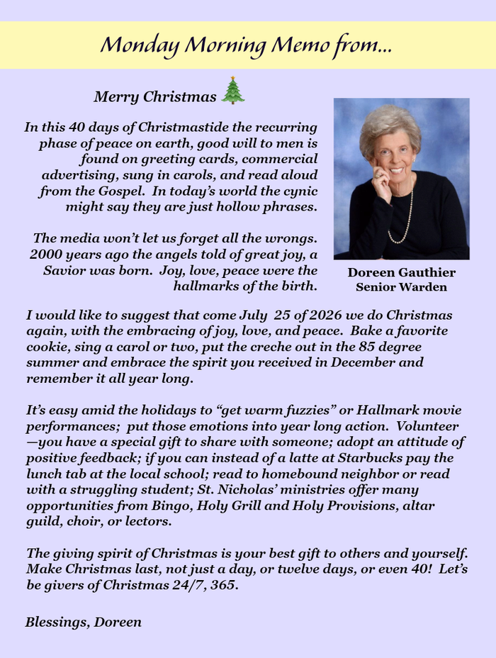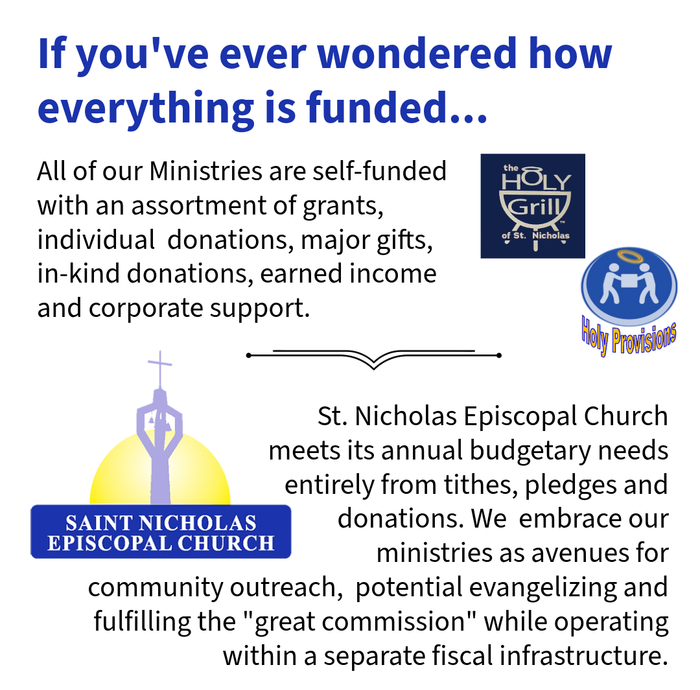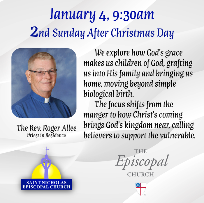 Plus, St. Nicholas gives away a $15 Publix Gift each game day and monthly there are 4 (two on Thursday and two on Sunday) $50 cash give-a-ways! Sun, January 4, 2026Undie Sunday9:30 AMPlease donate new men's and women's underwear to distribute to the homeless. Sunday Service9:30 AMHoly Eucharist followed by Coffee Hour in Parish Hall BINGO!2:00 PMDoors open at 1:00pm Ministry of Hospitality and Entertainment, BINGO provides our neighbors (particularly senior citizens) a safe and fun place for recreation.