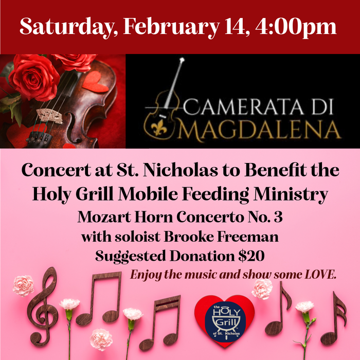 Plus, St. Nicholas gives away a $15 Publix Gift each game day and monthly there are 4 (two on Thursday and two on Sunday) $50 cash give-a-ways! Sat, February 14, 2026Camerata di Magdalena4:00 PMFlorida's Uniquely Baroque Youth Orchestra based in Coral Springs. "Helping the Homeless One Concert at a Time" by donating all proceeds from concert donations to the Holy Grill Mobile Feeding Ministry. Suggested Donation: $20