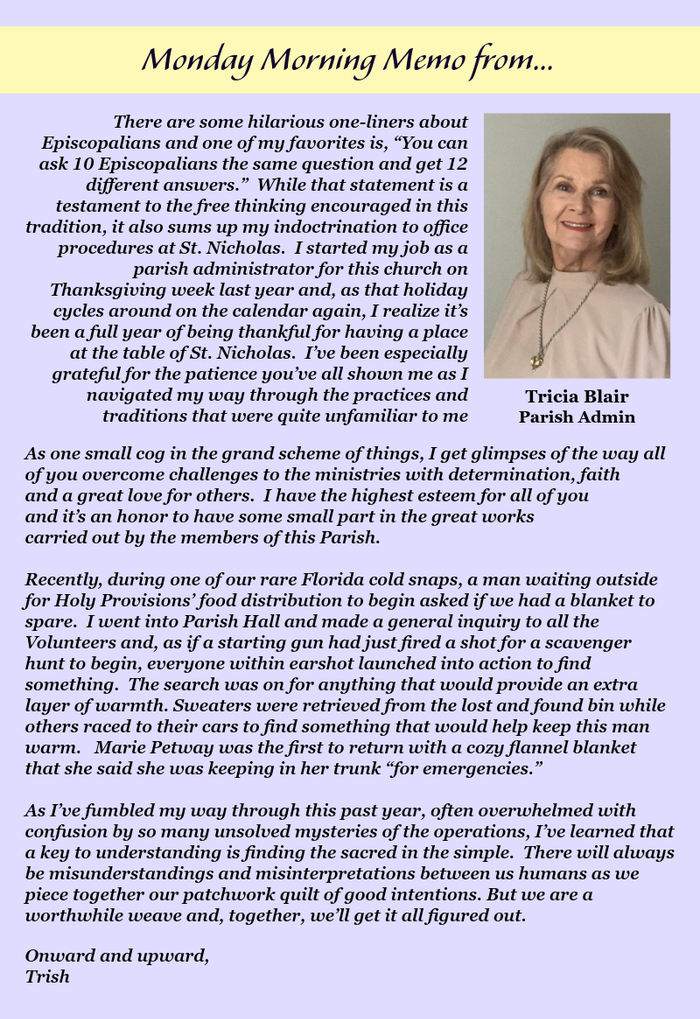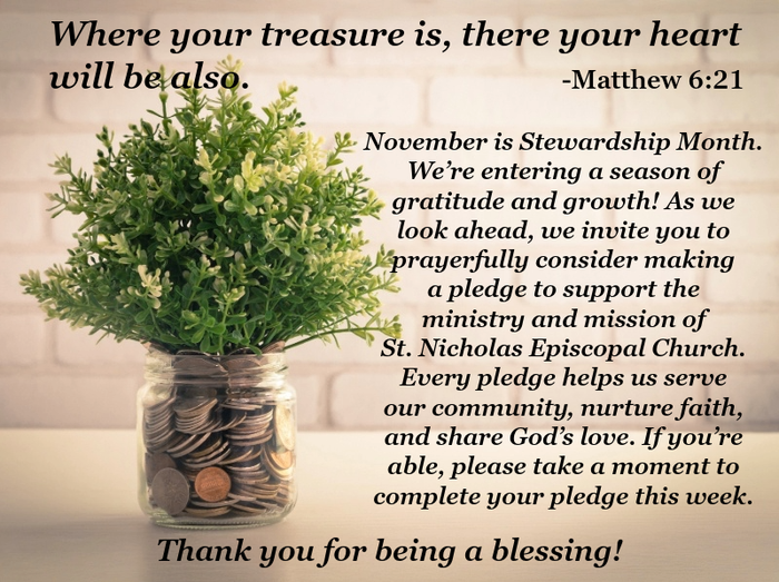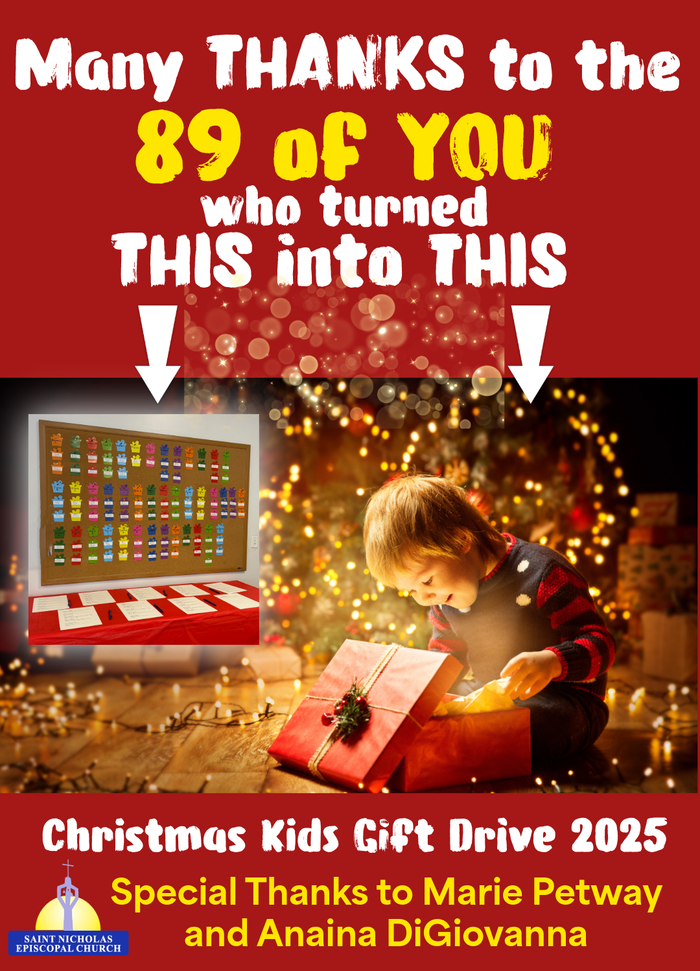 Plus, St. Nicholas gives away a $15 Publix Gift each game day and monthly there are 4 (two on Thursday and two on Sunday) $50 cash give-a-ways! Sun, November 23, 2025Sunday Service9:30 AMHoly Eucharist followed by Coffee Hour in Parish Hall Blood Pressure Checks10:30 AMProvided by Parish Nurse, Cheryl Lewis, RN in the Parish Hall following service. Please take advantage of this life-enhancing ministry. BINGO!2:00 PMDoors open at 1:00pm Ministry of Hospitality and Entertainment, BINGO provides our neighbors (particularly senior citizens) a safe and fun place for recreation.