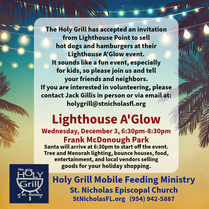 Thanksgiving Potluck, 2:00pm Woodcraft Sale, November 30, 10:30am Featuring the creations of woodworking artist, Everett Yankie, these pieces are as visually stunning as they are functional. Mr. Yankie, a member of our parish, generously gives all proceeds of the sale of these unique, handcrafted items to benefit the Holy Grill™ Mobile Feeding Ministry, the signature ministry of St. Nicholas Episcopal Church. Tropical Wave, December 6, 5:00pm Tropical Wave